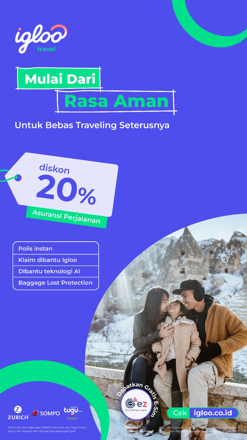 Lengkapilah momen perjalananmu dengan Asuransi Perjalanan terbaik dari Igloo. Selain Asuransi Perjalanan, Igloo juga menyediakan berbagai asuransi lain seperti Asuransi Kesehatan, Asuransi Mobil, Asuransi Motor, dan Asuransi Hewan Peliharaan. Dapatkan penawaran menarik dan Diskon mulai dari 15% untuk setiap perjalanan Domestik dan Internasional yang kamu lakukan.